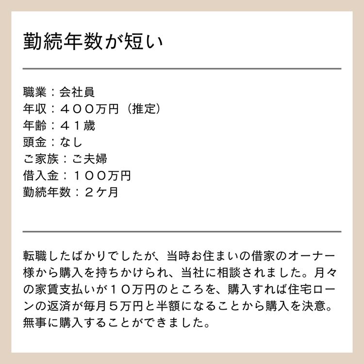 その1.住宅ローン通過実績多数住宅ローンはどの不動産業者に依頼しても同じだと思っていませんか? 当社には、どこの不動産業者でも「住宅ローンには通りません」「無理です」と言われて困り果てたお客様が数多くいらっしゃいます。 こうしたお客様の9割以上が、当社でマイホームの夢を実現させています。 つまり、住宅ローンに強い不動産業者とそうでない不動産業者がいるということです。実際、「自分で融資してくれる銀行を見つけて下さい」という不動産業者もいます。