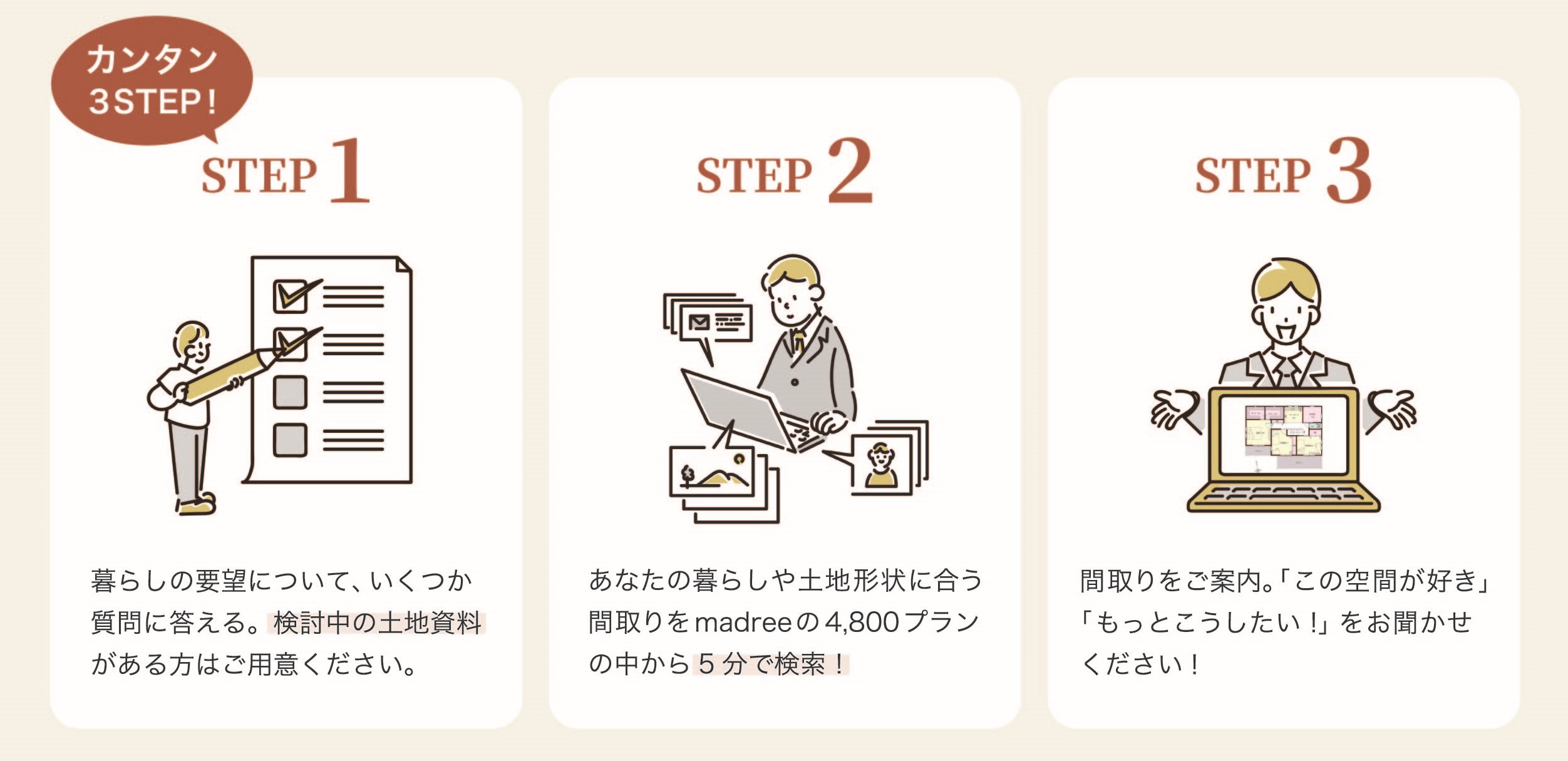 日本最大級の間取り作成サービス「madree」との連携により、全国の建築家が作成した4800の間取りプランから、ご希望条件で間取りをシミュレーションできます。