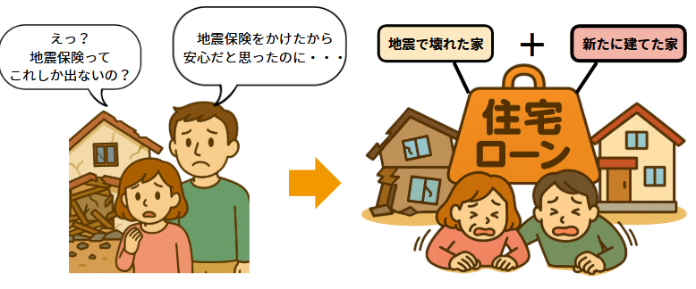 地震で建物に被害が生じた場合、地震保険だけで直すことは不可能だということを。