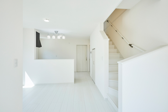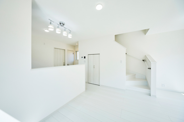 白を基調とした明るいリビングが、階段へと続く開放的な空間を演出しています