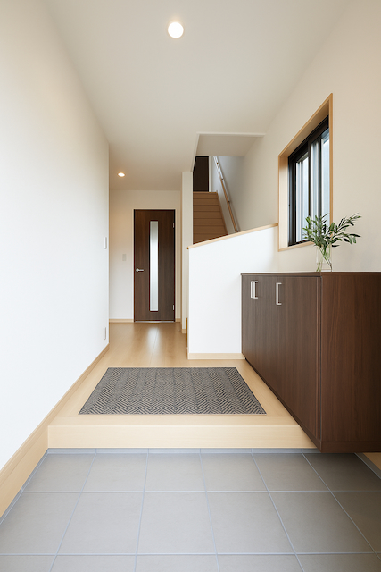木の温もりを感じる玄関が、家族とゲストを心地よく迎え入れます。 ※インテリアはAIで作成されたイメージです。 |