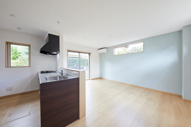 優しいブルーのアクセントクロスが映える、家族の時間を彩る明るいリビング。 ※インテリアはAIで作成されたイメージです。 |