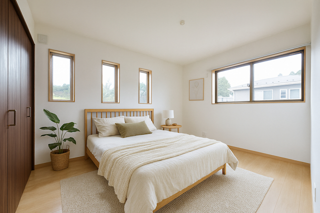 木のぬくもりと柔らかな光に包まれる、心地よいベッドルーム。 ※インテリアはAIで作成されたイメージです。 |