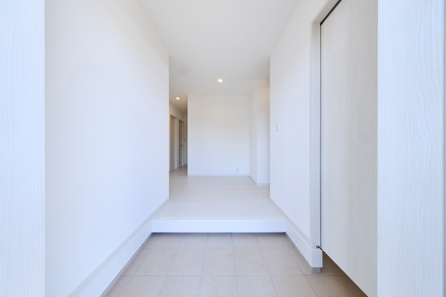 シンプルで清潔感のある玄関、シューズクロークも備わり収納力抜群 |