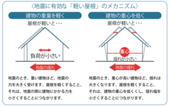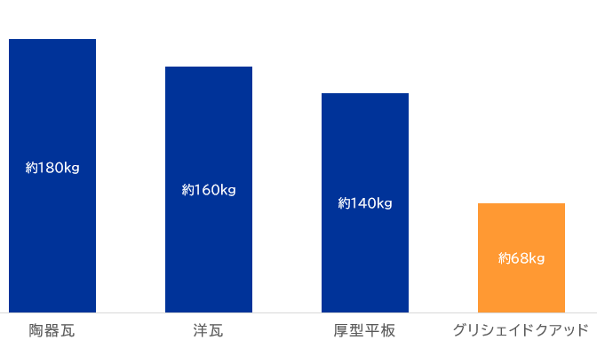 ホーム 標準仕様 外装 屋根 屋根 屋根について 軽い屋根の減震効果で、地震の揺れを軽減 カラーベストは全商品、一般的な陶器瓦の1/2以下の軽量さ。屋根を軽くし、建物の重量を軽く、 重心を低くすることによる「軽い屋根の減震効果」が期待できます。 □屋根材別「重さ」比較(kg/坪) 一軒の家の(屋根面積100㎡(約30坪)で比較すると 陶器瓦はグリシェイドクアッドに比べて 乗用車約3台分以上の重量(約3.5t)が 余分にかかる。 □軽い屋根の減震効果 □軽い屋根のメカニズム 屋根の形は選べます