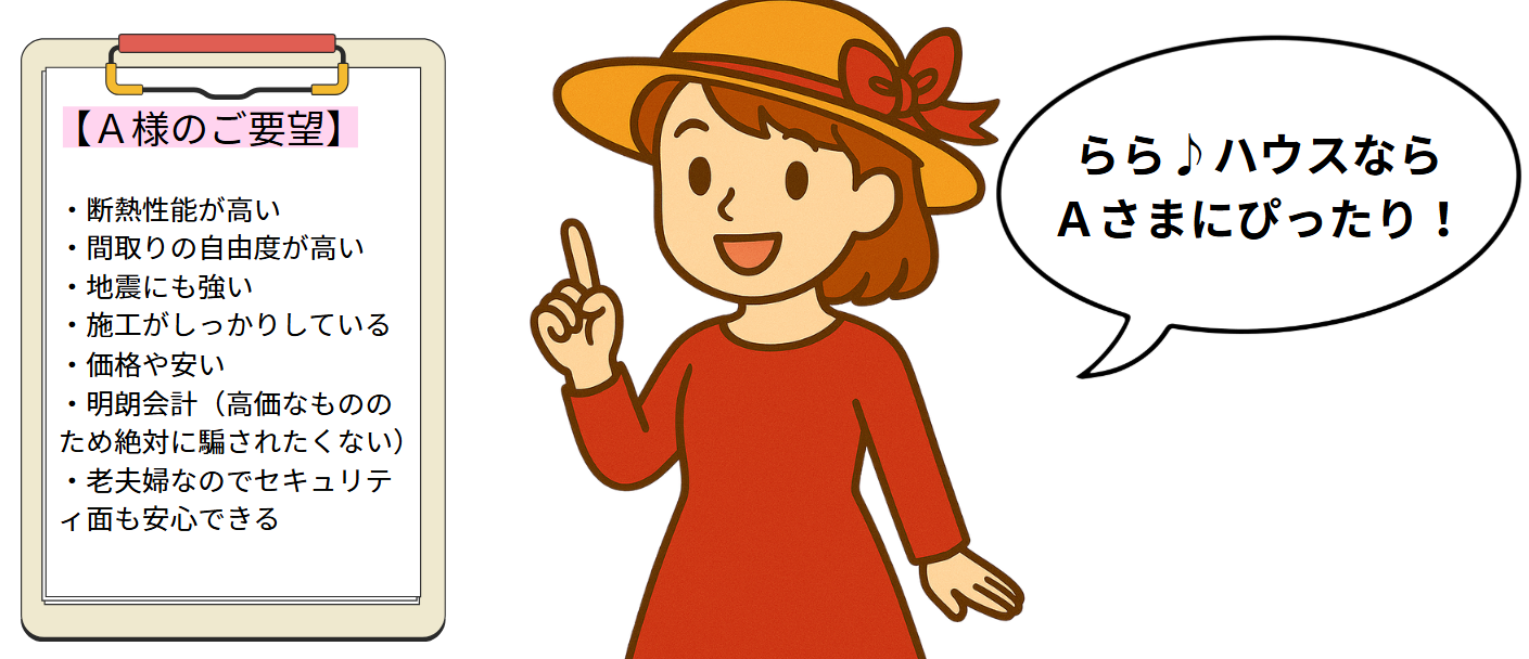 らら♪ハウスを建てるお客様の多くは、ホームページを熟読してからご来店されます。その理由はここまで標準仕様を開示している会社は他にないからです。 神奈川県横浜市にお住まいだったA様もそのひとりです。 「基礎や断熱材、耐力壁の仕様など、素人ではわからないことが |