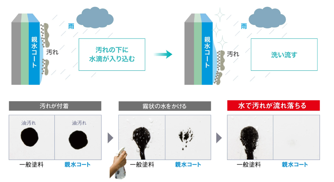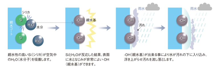親水コートの表層は水になじみやすい親水基に覆われています。雨が降れば親水基が汚れとの間に雨水を入り込みやすくするため、壁に付着した汚れが浮き上がり、雨水と一緒に洗い流します。