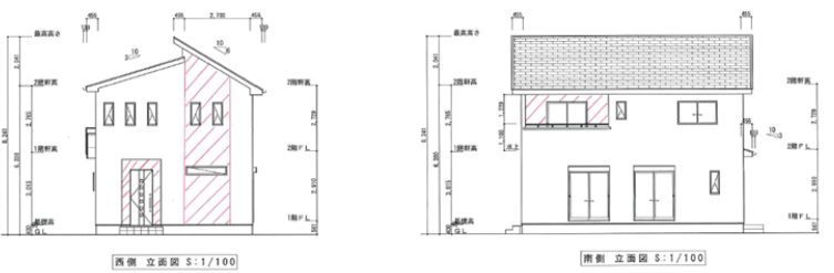 立面図に、張り分けたいサイディングを朱書きで指示