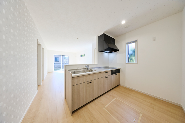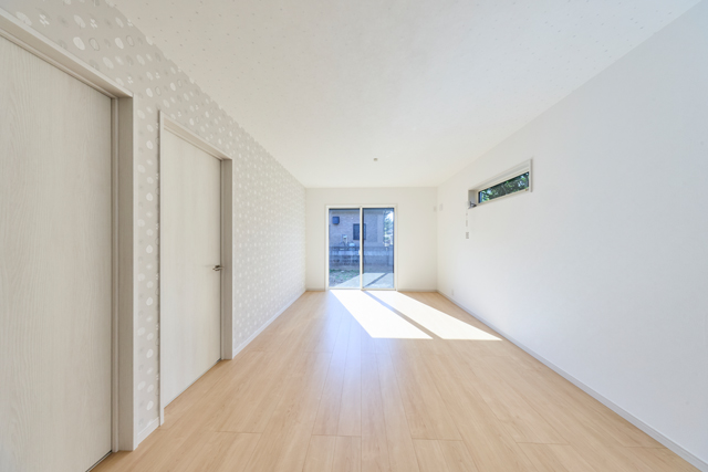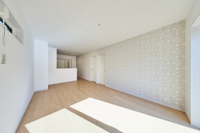 柔らかな日差しと明るい壁紙が、心地よい空間を演出しているリビング