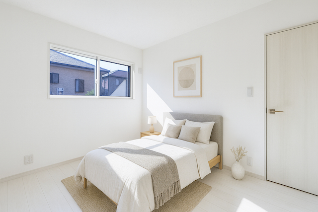 白を基調とした明るい寝室で、清潔感と落ち着きを感じられる空間 ※インテリアはAIで作成されたイメージです。 |