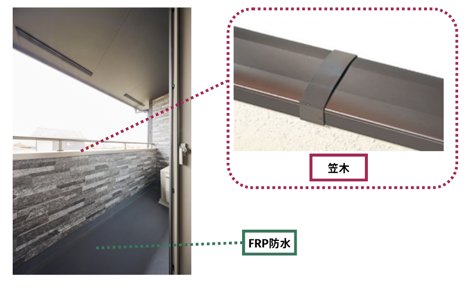 ホーム 標準仕様 外装 バルコニー バルコニー バルコニー FPR防水 FPRとは、Fibre Reinforced Plasticsの略で、繊維強化プラスチックのことです。 強度が高く、耐久性に優れています。また、継ぎ目もないため仕上がりがキレイです。 笠木 笠木とは、ベランダ立ち上がり部分の上部にかぶせる仕上げ材のことです。雨漏りの原因となることが多い場所であると同時に、通気を取らないと笠木内部の木が劣化する原因となります。ですので、防水と排湿を両立する適切な施工を行う必要がある箇所です。