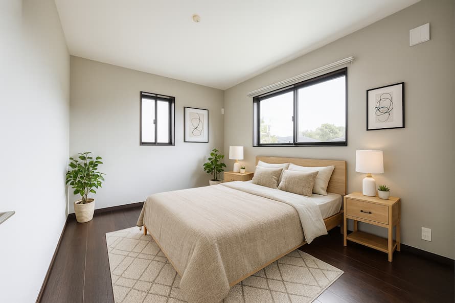 大きな窓から光が差し込む、明るく心地よい寝室 ※インテリアはAIで作成されたイメージです。 |