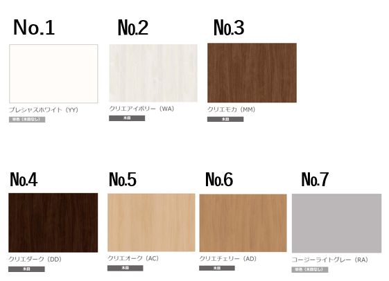 ホーム 標準仕様 建具 室内ドア 室内ドア 室内ドア □ラシッサS LAA または同等品 □洋室は開き戸、和室は引き戸となります。 □色は、お選びいただけます。 □リビングのみ、ガラス入りデザインをお選びいただけます リビング以外 下記の色からお選びいただけます リビング リビング用の室内ドアは、ガラス入りをお選びいただけます。
