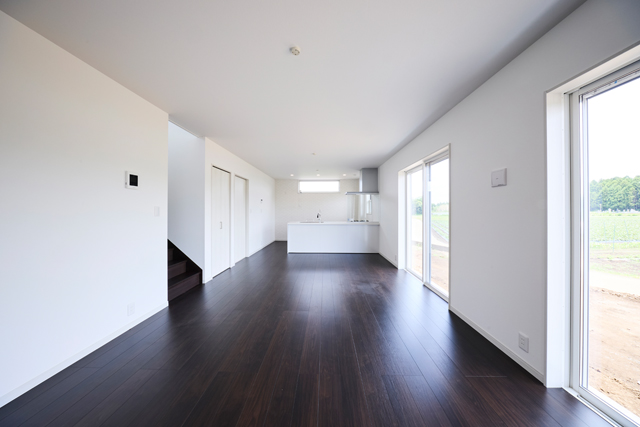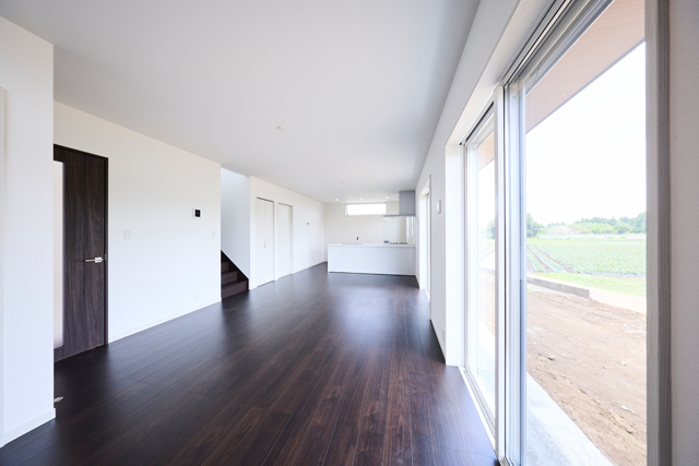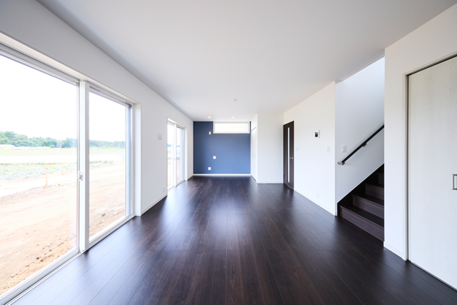 ダークフローリングが映える広々リビング、階段が空間のアクセントになっています