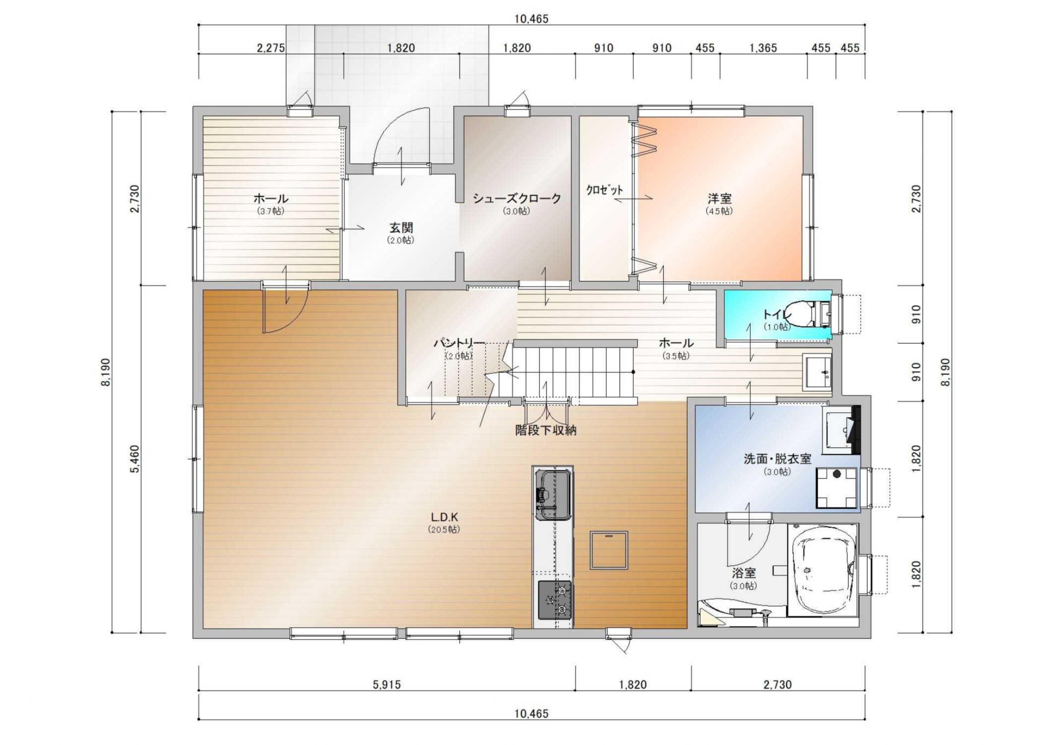 キッチンから洗面・浴室まで一直線の動線で、家事の移動時間を短縮。パントリーやシューズクロークも便利!