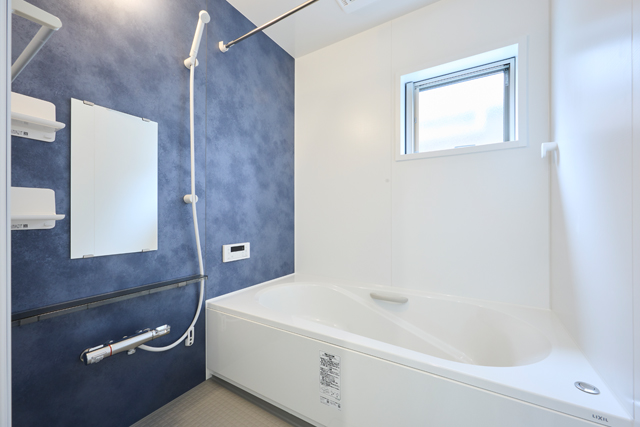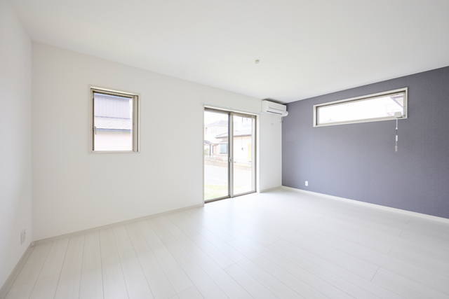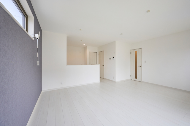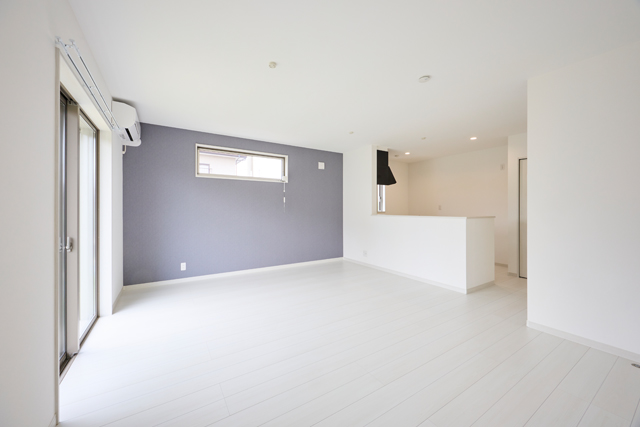 白い床とアクセントクロスが映える、爽やかでスタイリッシュなリビング