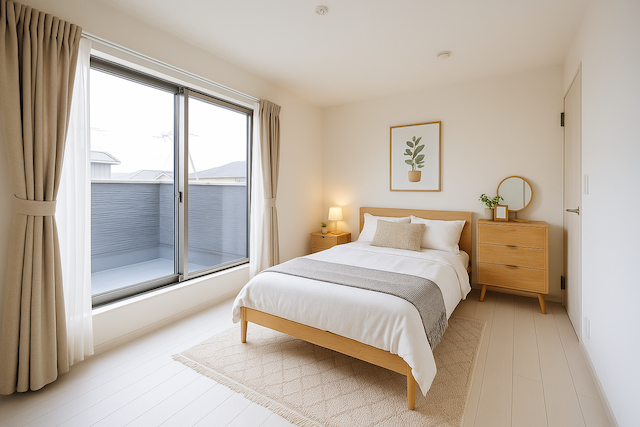 ナチュラルな木の温もりと柔らかな光に包まれた、心安らぐ寝室 ※インテリアはAIで作成されたイメージです。 |
