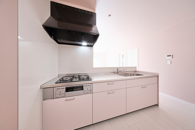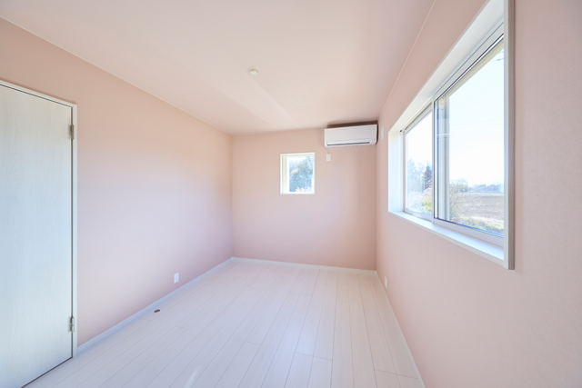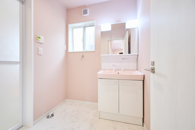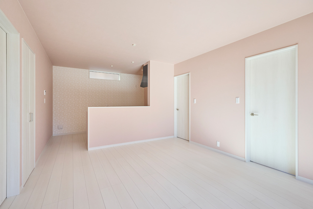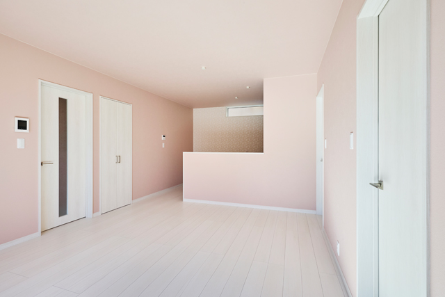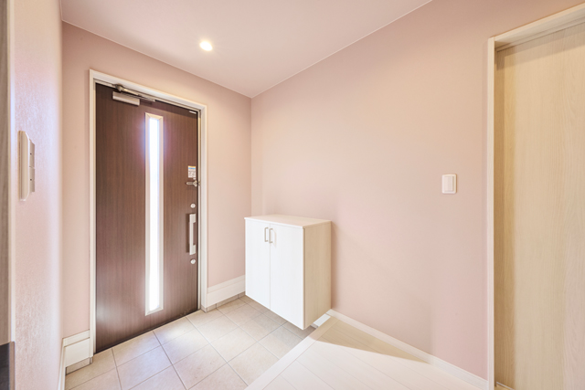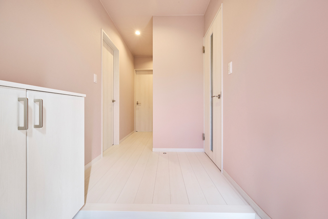 淡いピンクの壁が優しく迎えてくれる、可愛らしい玄関 |