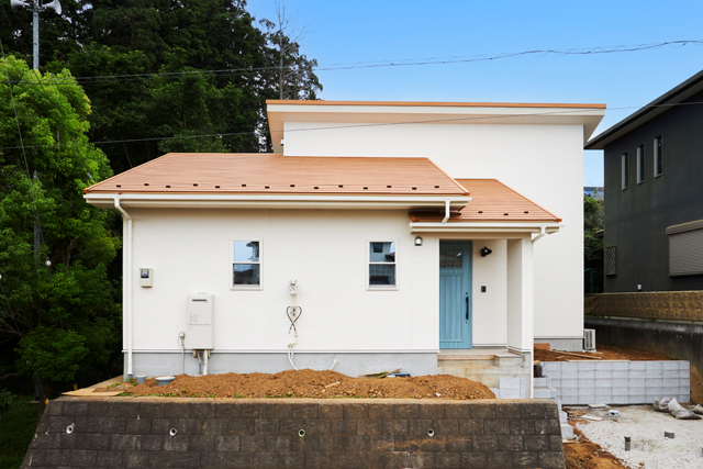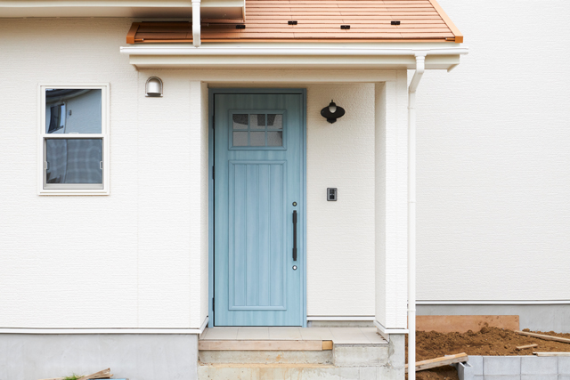 爽やかな白壁にやさしいブルーの玄関ドアが映える外観。 ※外構はAIで作成されたイメージです。 |
