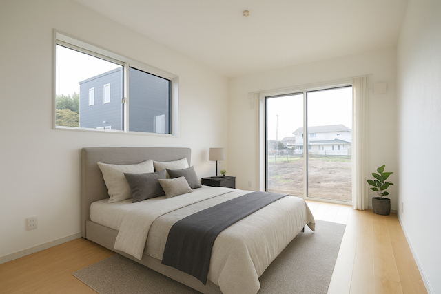 やわらかな光に包まれるベッドルーム。落ち着いたカラーで心からくつろげる空間です。 ※インテリアはAIで作成されたイメージです。 |
