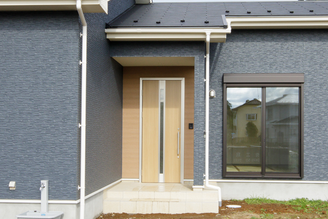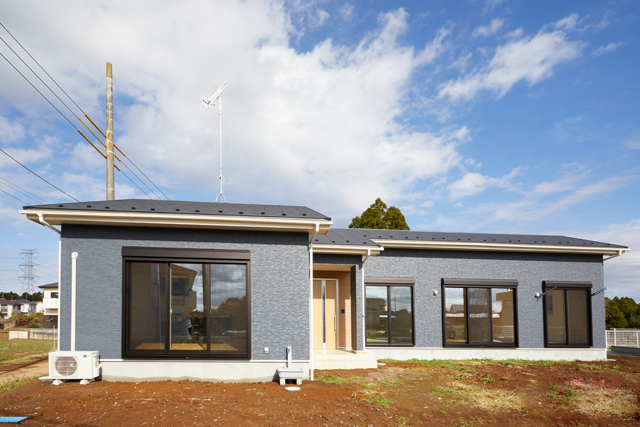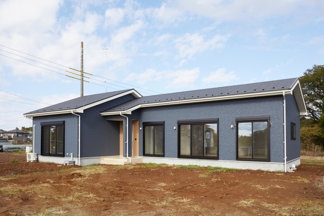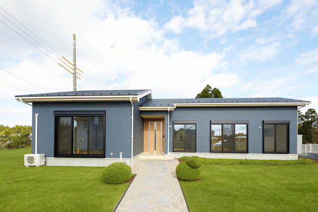 落ち着いたブルーの外観が美しい、平屋のモダンな住まい。大きな窓から差し込む光が、心地よい暮らしを演出します。 ※外構はAIで作成されたイメージです。 |