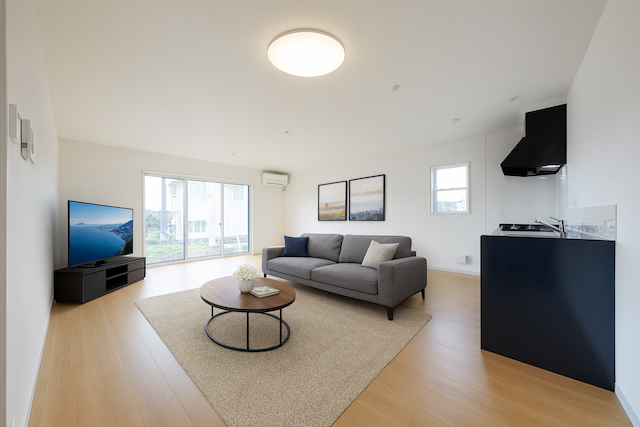 大きな窓から光が差し込む、開放感あふれるリビング。家族が自然と集まる心地よい空間です。 ※インテリアはAIで作成されたイメージです。 |