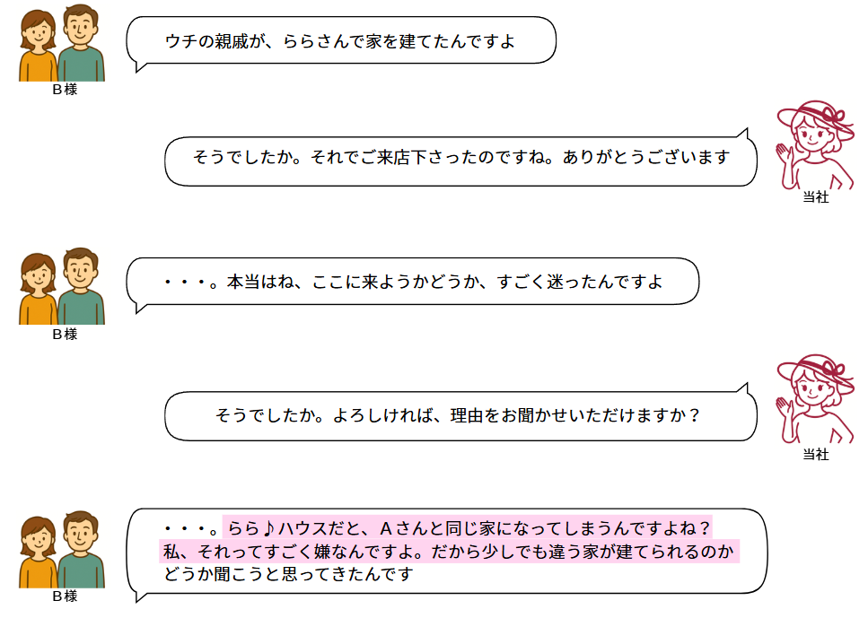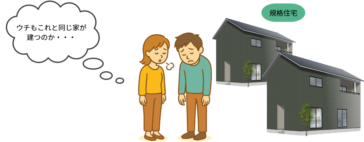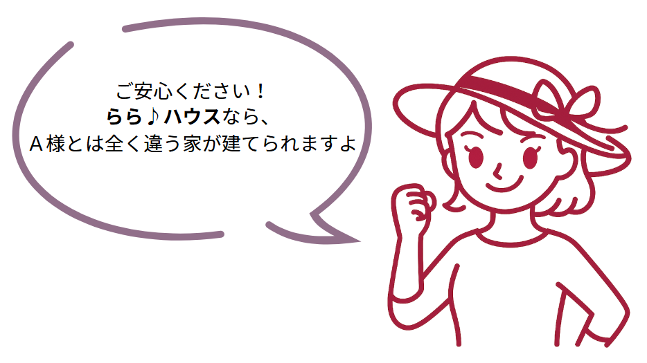 ホーム らら♪ハウスとは 「楽しく選ぶ」を徹底追及 「楽しく選ぶ」を徹底追及 「楽しく選ぶ」を徹底追及 規格住宅って、どれも一緒でしょ? らら♪ハウスは、注文住宅の中の「規格住宅」です。「規格住宅」というのは、あらかじめ決められた仕様の中から選ぶタイプの注文住宅です。ですので、お客様の中には、建売と同じように「何も選べない」と思っている方もいらっしゃいます。らら♪ハウスなら、規格住宅といえども選ぶ楽しみがたくさんあります。目指したのは、規格住宅と自由設計のいいとこどり。 以前、当社で家を建てて下さった施主のA様の親戚であるB様がご来店の際、こんな会話をしました。 規格住宅でも、こんなに違う家が建てられます A様邸 B様邸