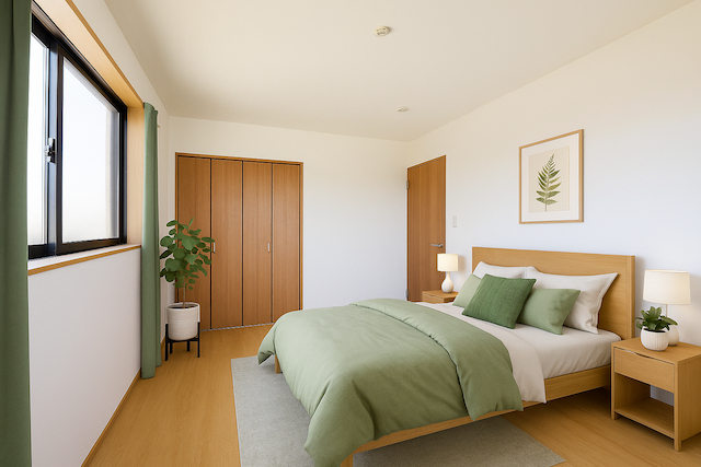 明るい光とナチュラルな素材感が、やさしく調和する寝室。 ※インテリアはAIで作成されたイメージです。 |