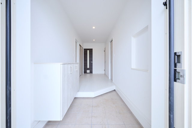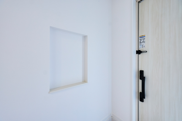 ニッチがアクセントになった、白を基調とした明るく清潔感のある玄関 |