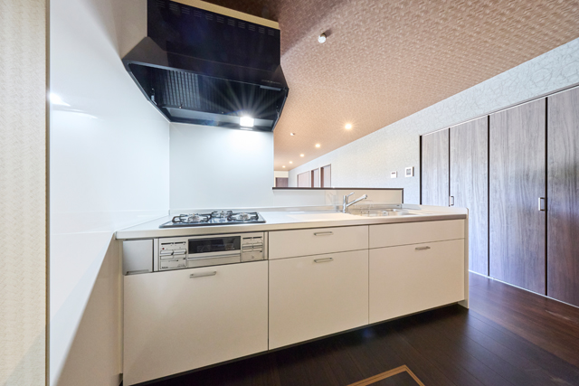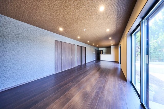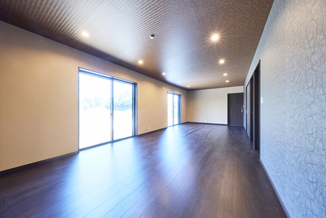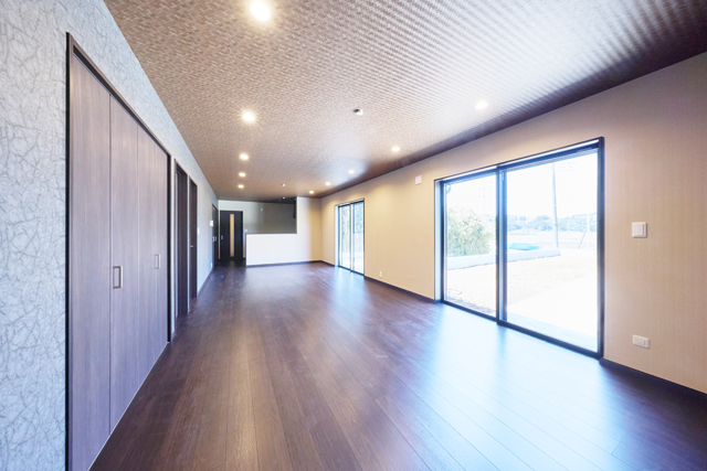 重厚感のある色合いと広がりを感じる、落ち着いた雰囲気のリビング