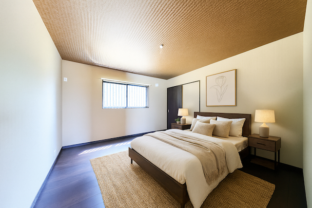 落ち着いた色調と柔らかな灯りが心地よい寝室 ※インテリアはAIで作成されたイメージです。 |