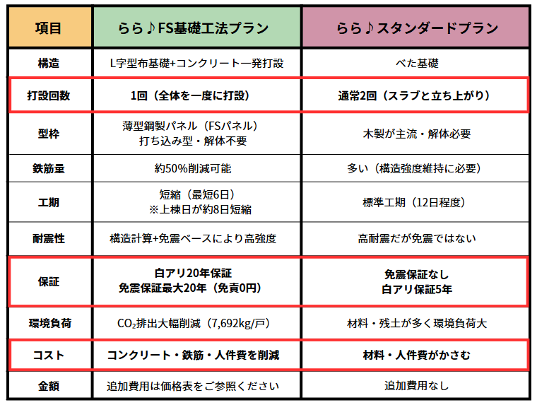 ホーム 標準仕様 基礎・構造 基礎 基礎 基礎 選べる2つの基本「基礎」プラン 「基礎」は、下記の2つのプランからお選びいただけます。 らら♪ハウスでは、これまでべた基礎プランのみでした。しかし、南海トラフ巨大地震がいつ来てもおかしくない状況にある中、地震に強く、もしもの場合にしっかりと保証が付くプランもお選びいただけるようにしたいと考え、免震補償付きのFS基礎プランをお選びいただけるようにしました。 べた基礎プランです。画像をクリックで詳細をご覧いただけます。 1億円の免震保証付き基礎工法プランです。画像をクリックで詳細をご覧いただけます。 基礎工法比較表