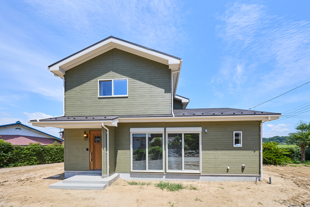 モスグリーンが自然に映える陽が差し込む家 ※外構はAIで作成されたイメージです。 |