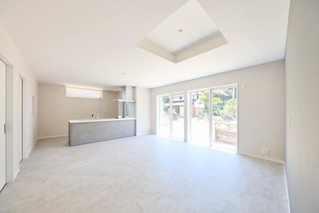 折り上げ天井が、リビングに開放感と上質さを添えています