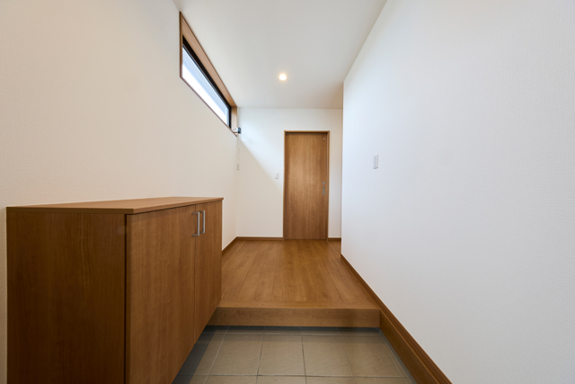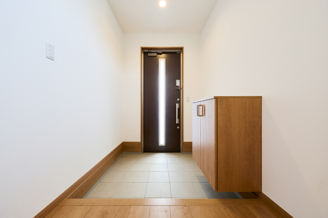 明るい光が差し込む窓で、清潔感のある玄関 |
