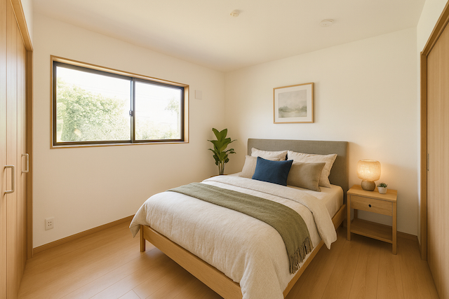 木の温もりと柔らかな灯りに包まれて、心からリラックスできる寝室 ※インテリアはAIで作成されたイメージです。 |