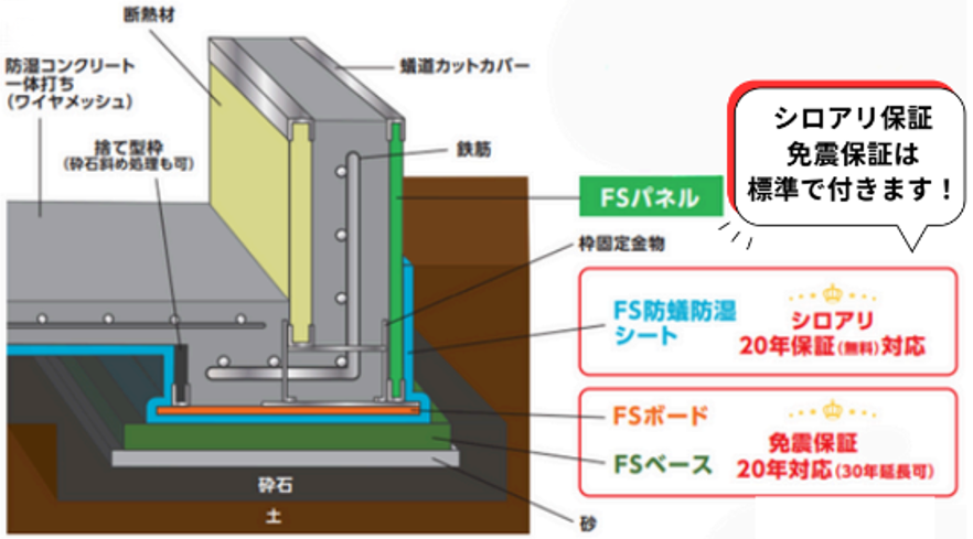 FS基礎工法は、建物と基礎の間に免震装置として