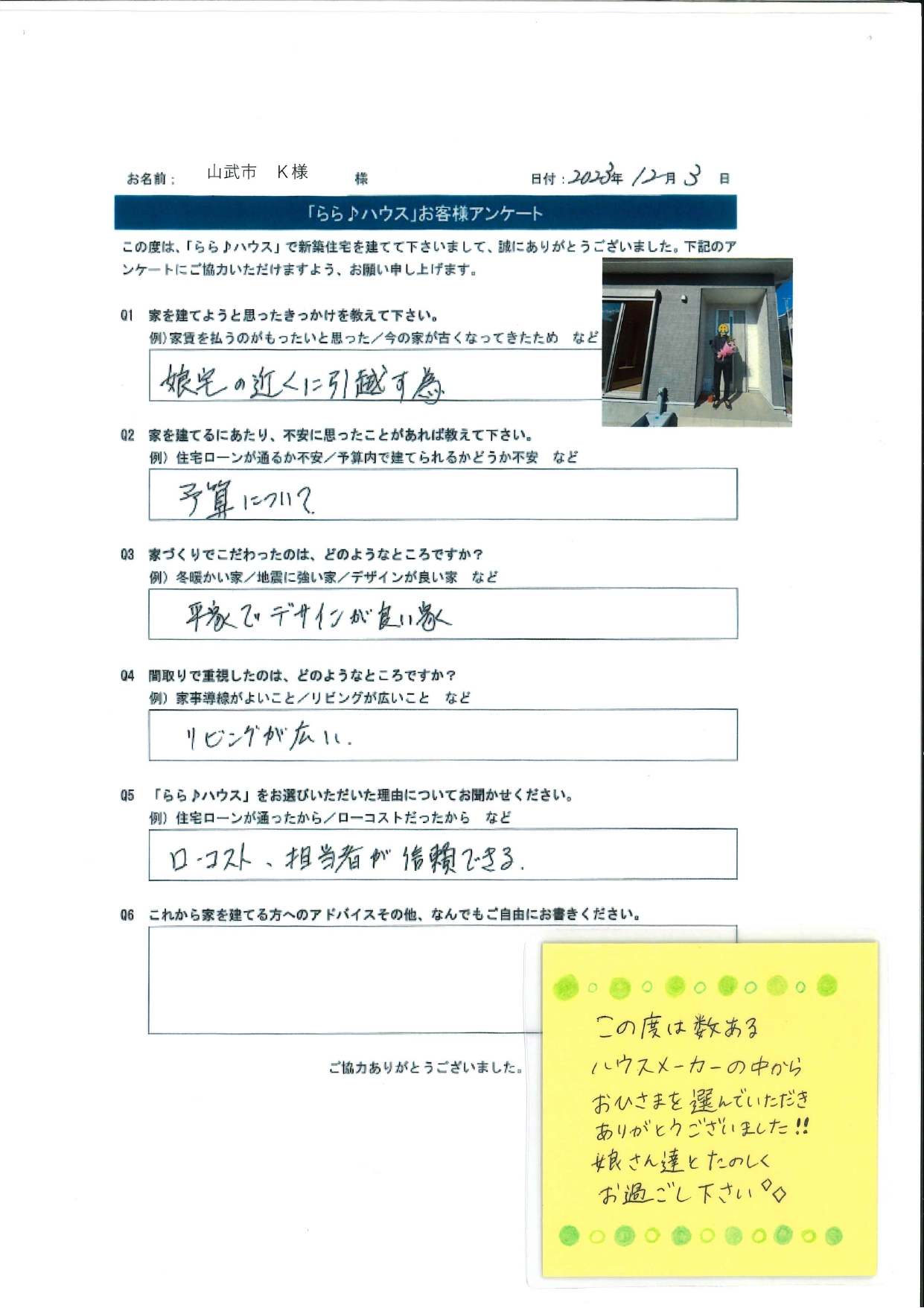 Q6. これから家を建てる方へのアドバイス、その他ご自由にお書きください。