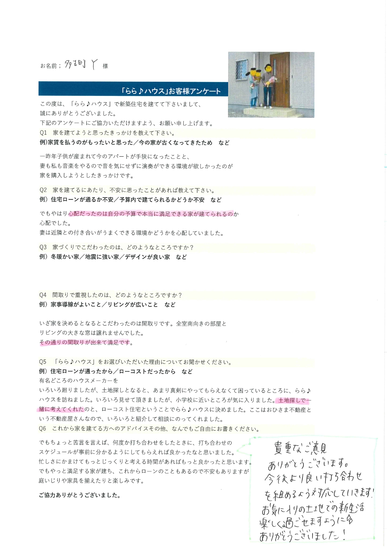 土地探しで一緒に考えてくれたのと、ローコストな住宅ということでらら♪ハウスに決めました。
